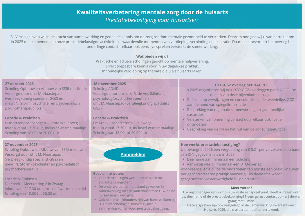 Bij Vicino geloven we in de kracht van samenwerking en gedeelde kennis om de zorg rondom mentale gezondheid te versterken. Daarom organiseren wij o.a. DTO-GGZ overleggen per HAGRO en scholingen. Huisartsen kunnen zich nog aanmelden voor de scholingen.